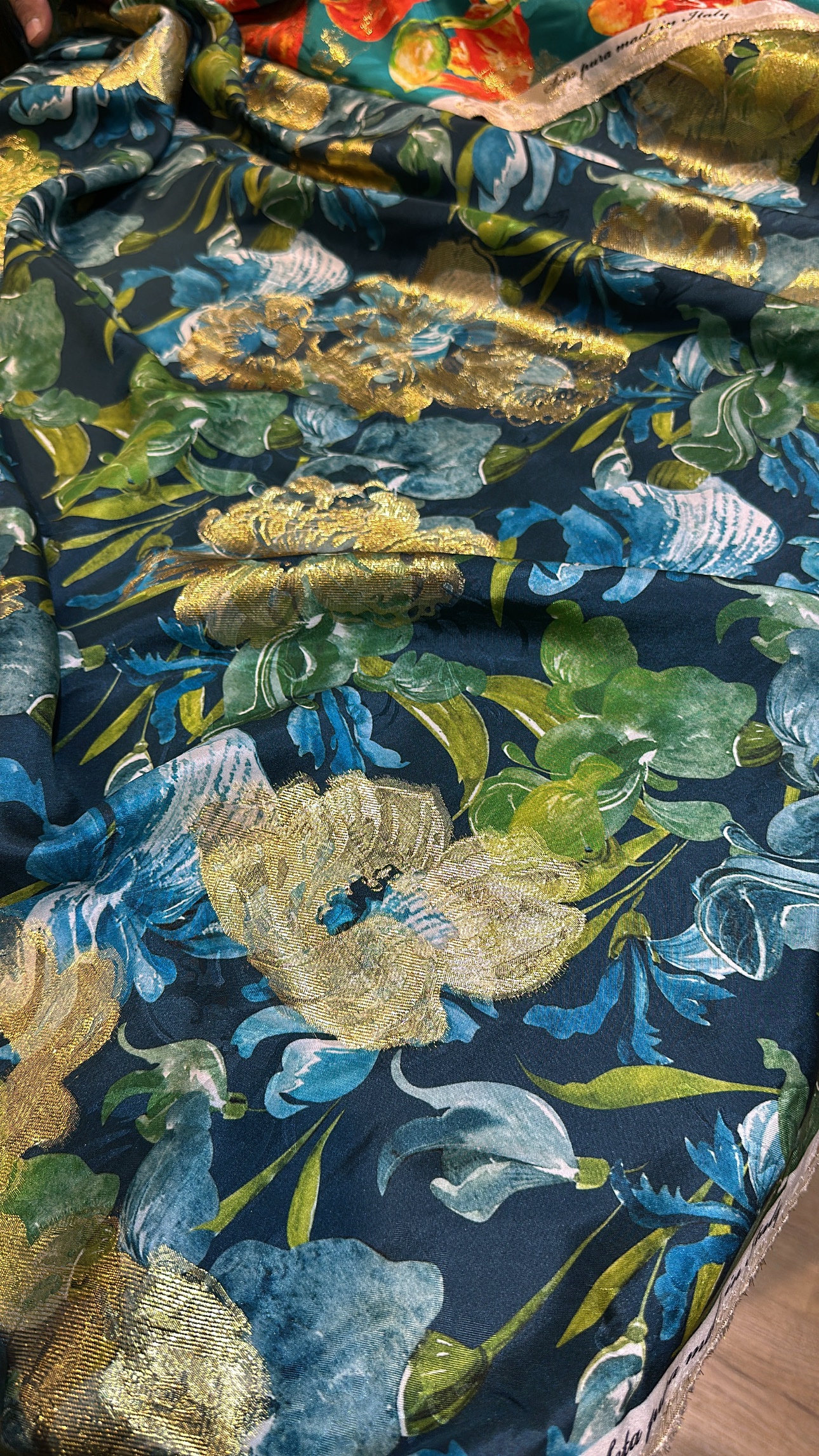 100% pure silk with lurex from Italy.